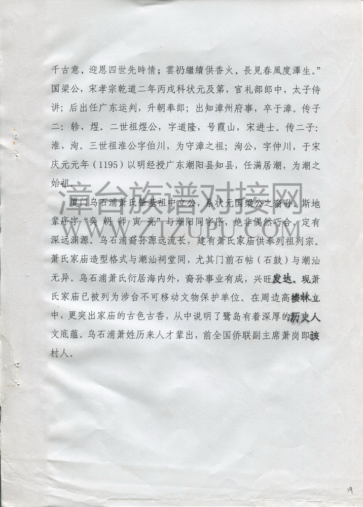 何时何地迁入:萧国梁,字挺之,永福十二都陈山,今永泰县岭路乡东山七斗村人,宋乾道二年丙戌科状元,后到漳州任职,遂家于漳